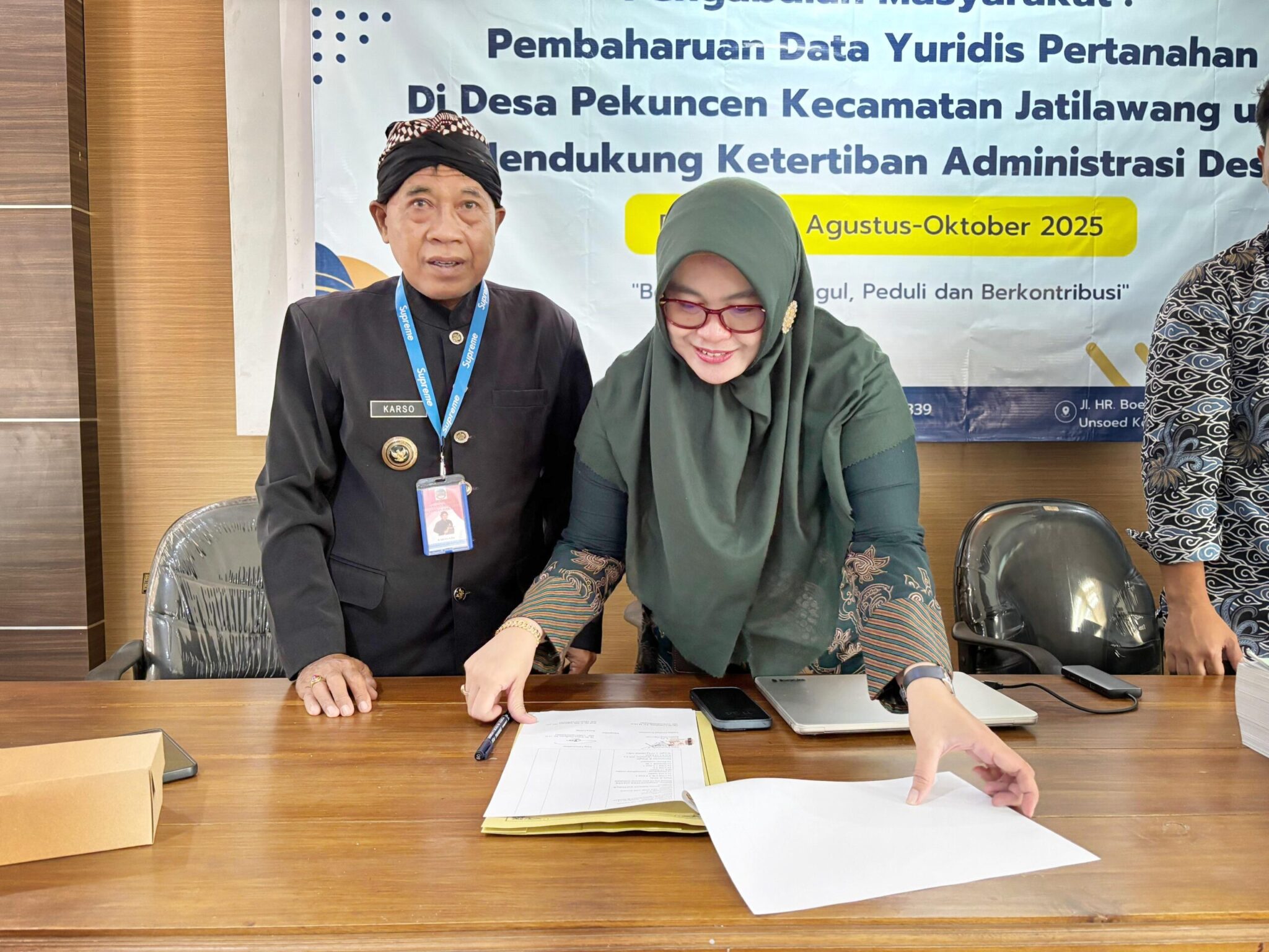 Kegiatan yang didanai melalui Skema Pengabdian Kepada Masyarakat Berbasis Riset Tahun 2025 ini berfokus pada pelatihan, pendampingan hukum, dan digitalisasi administrasi pertanahan di Desa Pekuncen, Kecamatan Jatilawang, Banyumas.